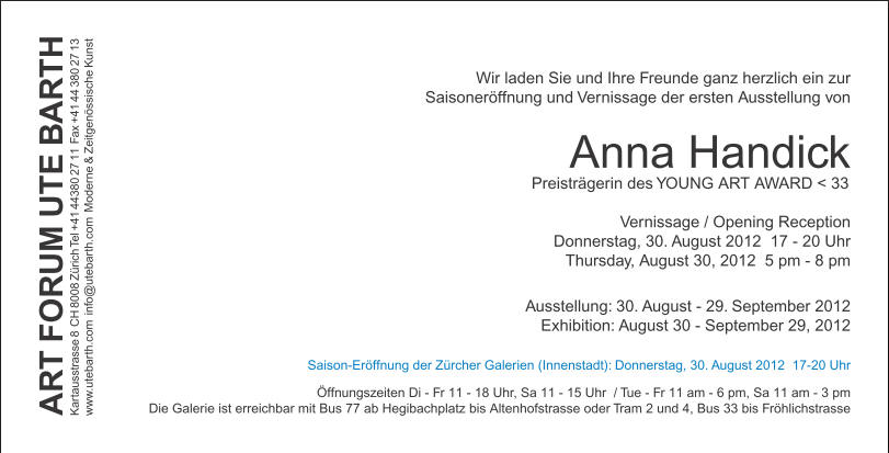 EINLADUNGSKARTE Ausstellung Anna Handick @ Galerie ART FORUM UTE BARTH, Zürich Ausstellung Anna Handick @ Galerie ART FORUM UTE BARTH, Zürich